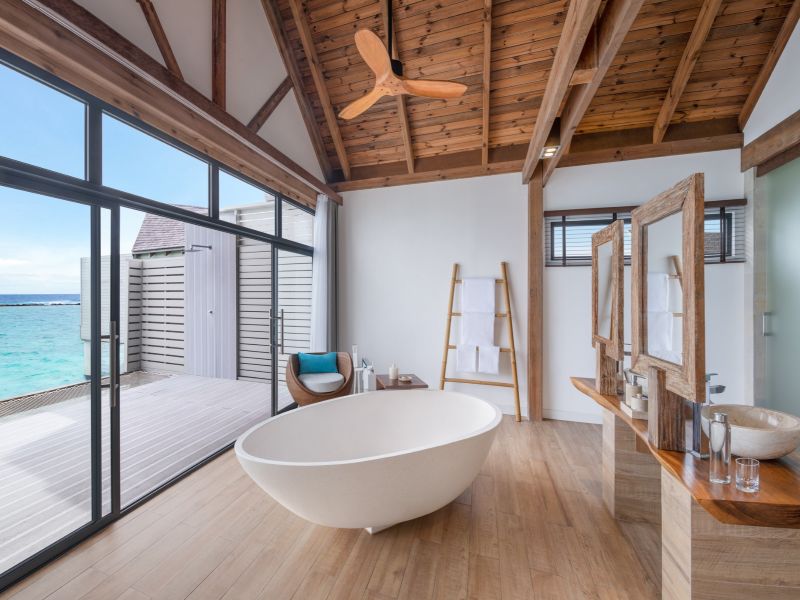 水上ヴィラにはガラス床とハンモック付きのお部屋もあり。140㎡の広々としたお部屋でバスタブからは海が見られる