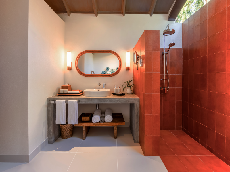 オープンエアの開放的なバスルームを備えています。