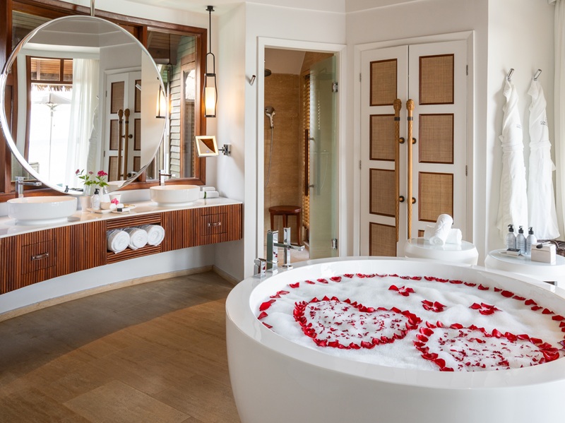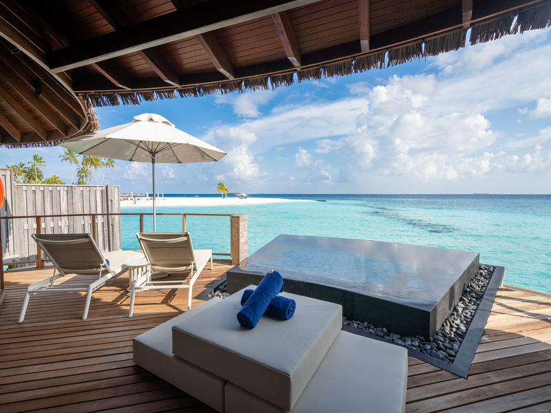 プライベートプール、サンデッキ、バスタブ付きの水上ヴィラ。